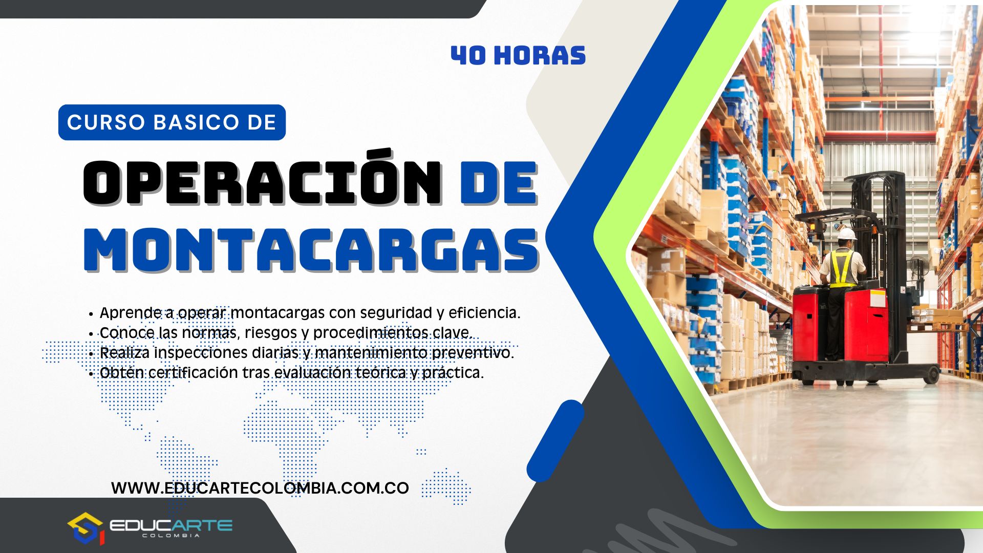 Este curso está diseñado para formar operadores capacitados en el manejo seguro y eficiente de montacargas en diversos entornos laborales. A lo largo de 40 horas de formación teórico-práctica, los participantes adquirirán conocimientos esenciales sobre el funcionamiento del equipo, inspecciones diarias, técnicas de operación segura y mantenimiento preventivo, cumpliendo con las normativas de seguridad vigentes.
